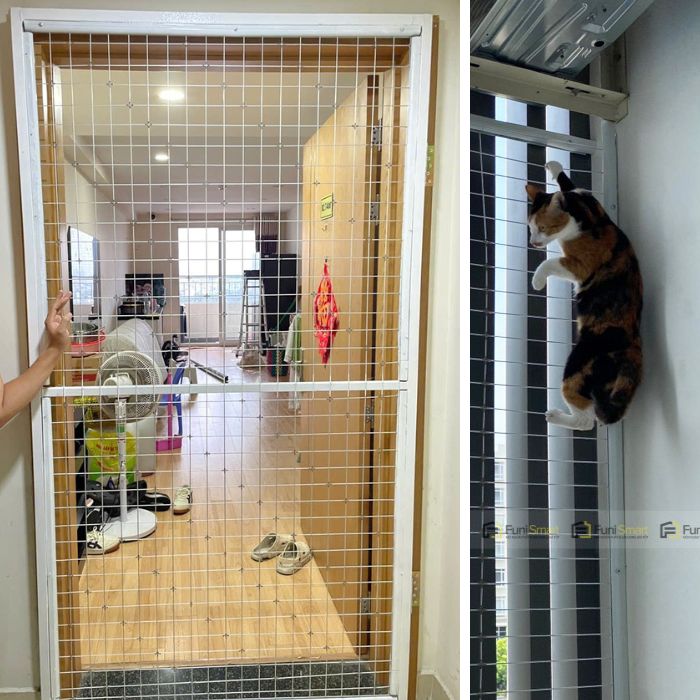 Cửa lưới an toàn dạng đóng mở cho mèo & thú cưngViệc đan lưới an toàn thành dạng cửa này giúp bạn sở hữu 1 chiếc cửa đóng mở linh hoạt vẫn đón gió, ánh sáng tự nhiên mà không phải canh chừng mèo hay thú cưng từng phút, hạn chế tối đa nguy cơ chạy ra ngoài hoặc gặp sự cố nguy hiểm. Lưới chịu lực cao kết hợp khung bền đẹp giúp mèo thoải mái leo trèo, quan sát bên ngoài mà vẫn trong tầm kiểm soát, mang lại cảm giác an tâm lâu dài cho người nuôi thú cưng mà vẫn giữ trọn sự thông thoáng cho ngôi nhà.