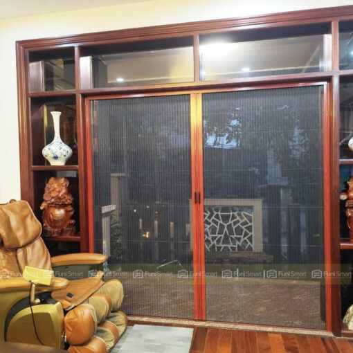 Cửa lưới xếp chống muỗi màu vân gỗ có ray giá tốt tại Funismart- Dạng lùa: Chống chuột được, chắc chắn, lưới inox full giá thành cao.